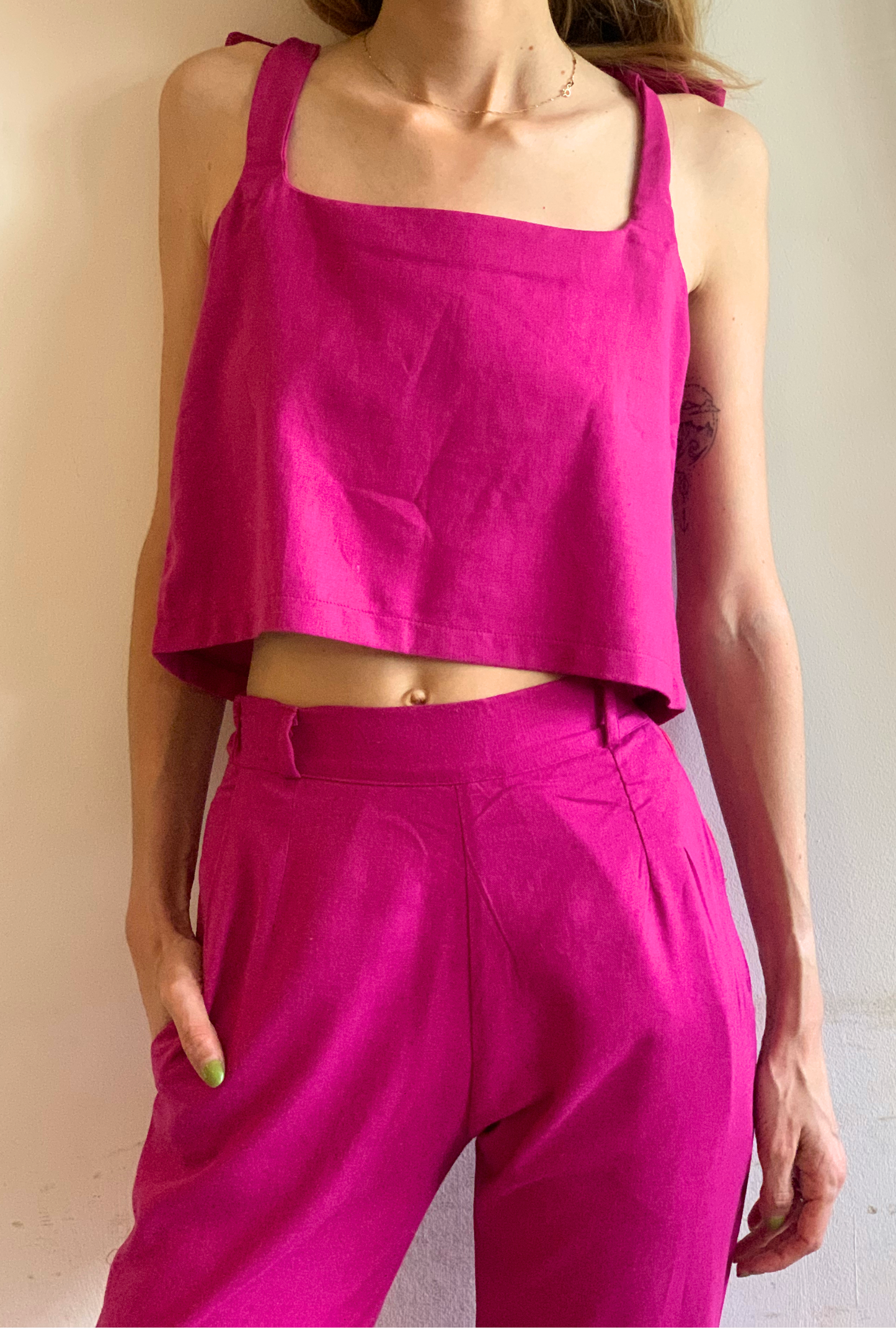 Le haut Safari est un haut court en lin avec des bretelles réglables et une encolure carrée. Portez-le en ensemble avec le pantalon Safari assorti ou associez-le à votre jean taille haute préféré.